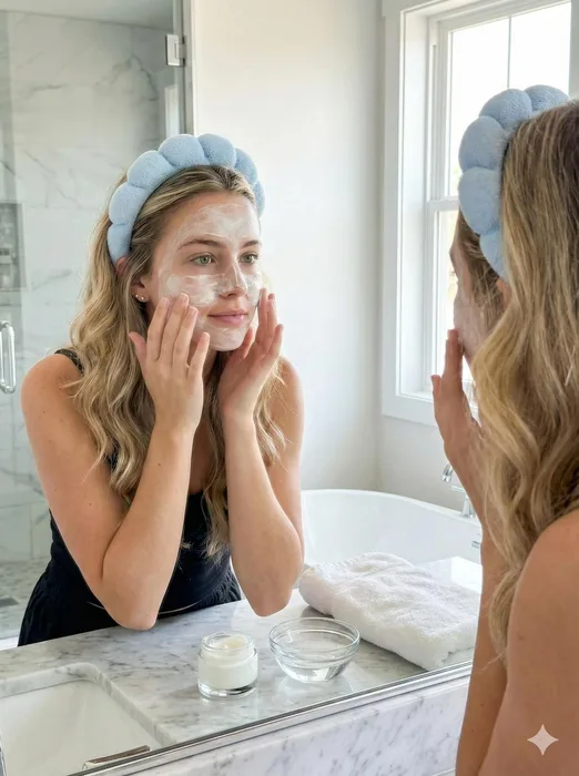 שומר על השיער הרחק מהפנים בזמן ניקוי, הסרת איפור או מריחת מסכות.
