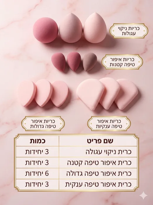 כוללת מגוון רחב של ספוגיות במרקמים וצורות שונות למריחה מדויקת, אחידה ונקייה של מייקאפ, קונסילר, פודרה, סומק ועוד.